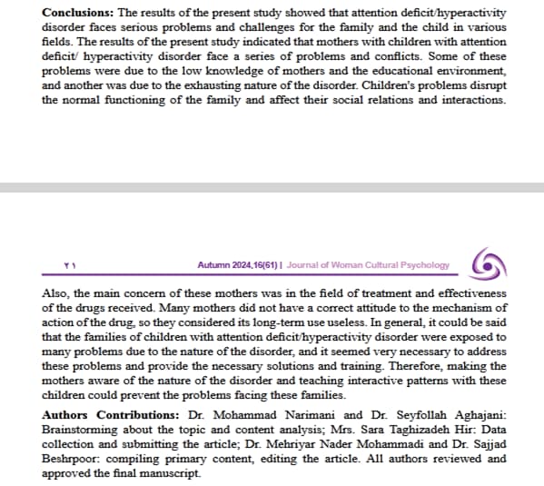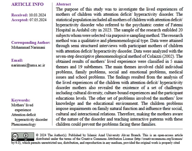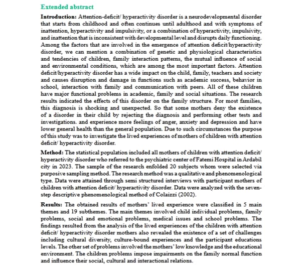 ترجمه عنوان: تجربه زیسته مادران دارای کودک مبتلا به اختلال نقص توجه/ بیش فعالی: مطالعه پدیدار شناختی