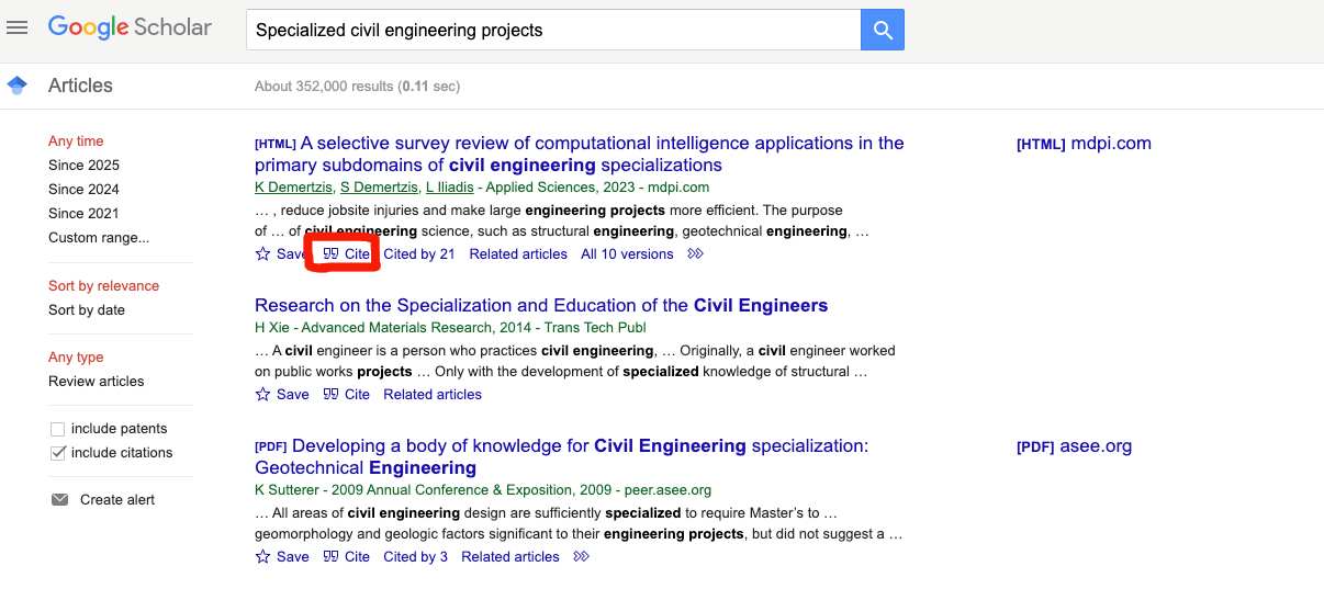 یک روش نوشتن منابع در مقاله استفاده از آپشن وب سایت گوگل اسکولار است. برای این کار ابتدا وارد سایت گوگل اسکولار شوید و عنوان مقاله ای که می خواهید به آن ارجاع دهی کنید را وارد کنید. بعد از به نمایش در آمدن مقاله مد نظر باید روی گزینه ای که در تصویر زیر مشخص شده کلیک کنید تا پنجره جدید برای شما باز شود.